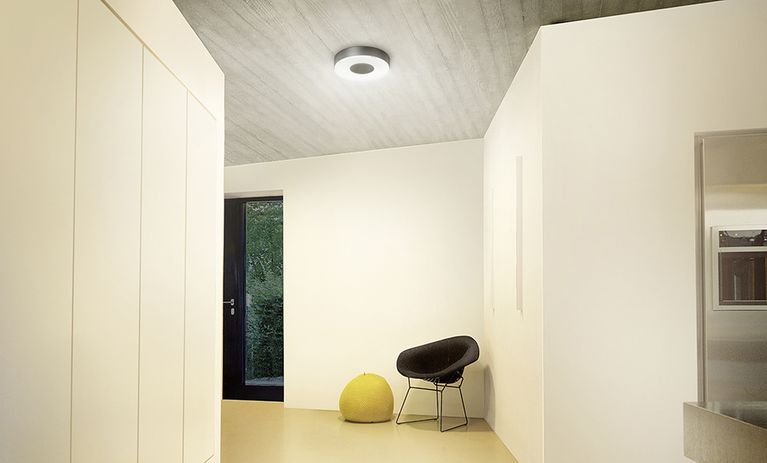 Si basa su questo concetto di base: L'illuminazione ambientale luminosa è integrata da un'illuminazione di zona mirata e completata da accenti atmosferici per creare un concetto di illuminazione equilibrato. Una combinazione di plafoniere per una luminosità di base, applique a LED per un'illuminazione di zona piacevole ed elegante e strisce LED per accenti indiretti funziona particolarmente bene nel corridoio.