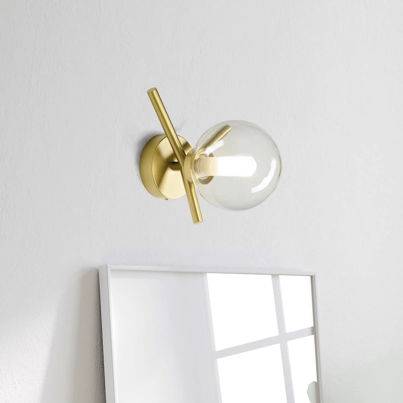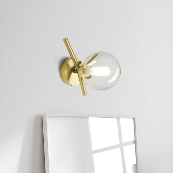 Lampada da parete monolampada Camely con struttura in metallo in finitura oro spazzolato e paralume sferico in vetro borosilicato Questa lampada da parete della serie Camely, ideata dall'architetto e designer italiano Davide Negri, convince come fonte di luce elegante per soggiorni e salotti. La struttura in metallo con attacco a parete rotondo e tre bracci corti è in look oro spazzolato. Il paralume in vetro borosilicato è suddiviso in un guscio esterno chiaro e sferico e in un cilindro interno sabbiato. Quest'ultimo racchiude la lampada G9 da inserire.