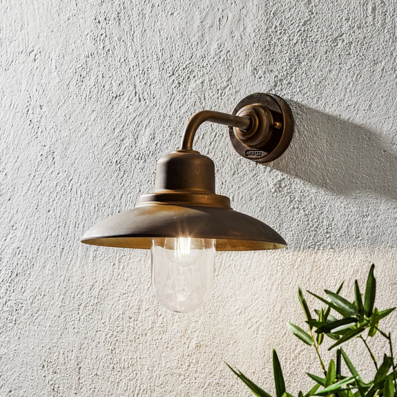Applique da esterno Susa in ottone anticato - resistente all'acqua di mare L'applique da esterno Susa colpisce per il suo aspetto rustico grazie alla sua forma e al suo colore, caratterizzato in particolare dalla superficie in ottone anticato. Il vetro trasparente del paralume garantisce un'illuminazione ambientale ottimale. Dotata di grado di protezione IP44.