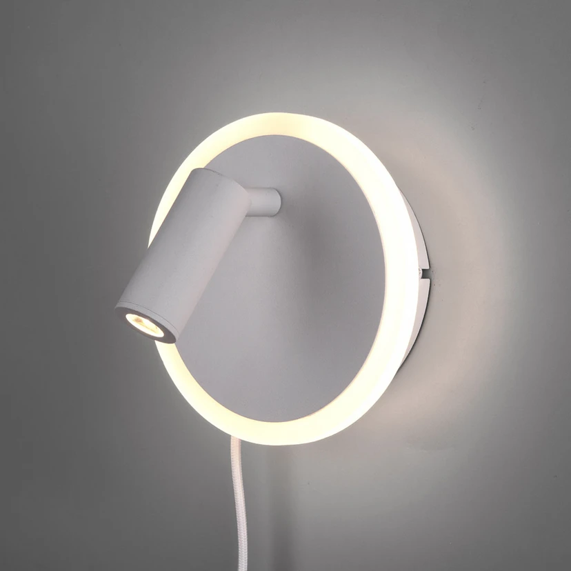 Oltre all'illuminazione a LED a forma di anello, che illumina la stanza verso la parte anteriore e crea un anello di luce decorativo, sulla piastra metallica rotonda è montato un faretto per l'illuminazione mirata. Il faretto viene acceso da un interruttore posto sulla parte superiore del supporto a parete, l'anello luminoso dall'interruttore a cavo esistente.