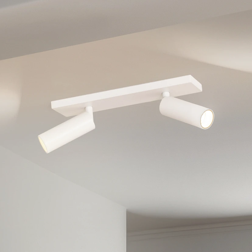 La lampada Brinja Slim è realizzata in un semplice bianco ed è composta da due faretti cilindrici, entrambi orientabili e inclinabili. I faretti sono fissati a un supporto rettangolare che ne consente il montaggio sia a parete che a soffitto.