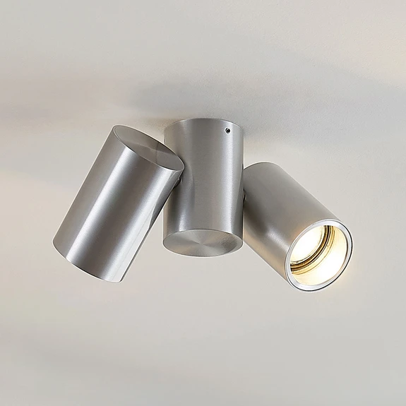 Faretto da soffitto Gesina in alluminio GU10 con due paralumi cilindrici Questa plafoniera è caratterizzata da una particolare uniformità geometrica, poiché tutti e tre i componenti hanno la forma di un cilindro. L'elemento centrale è il fissaggio per soffitto, mentre a sinistra e a destra si trovano i due paralumi, che sono collegati alla staffa rotonda tramite giunti e possono quindi essere allineati in modo flessibile. Il risultato è un'illuminazione a forma di spot che crea un effetto speciale nei soggiorni. L'aspetto è molto contemporaneo, in parte grazie alla superficie in alluminio opaco, ma anche il linguaggio del design incarna una modernità assoluta.