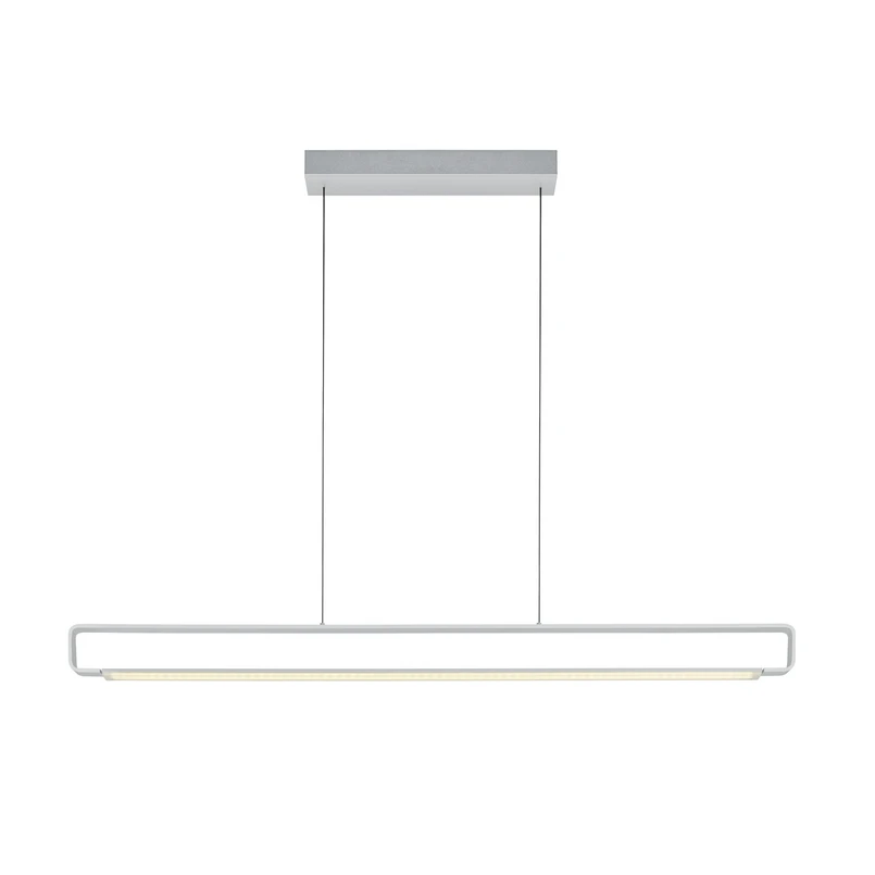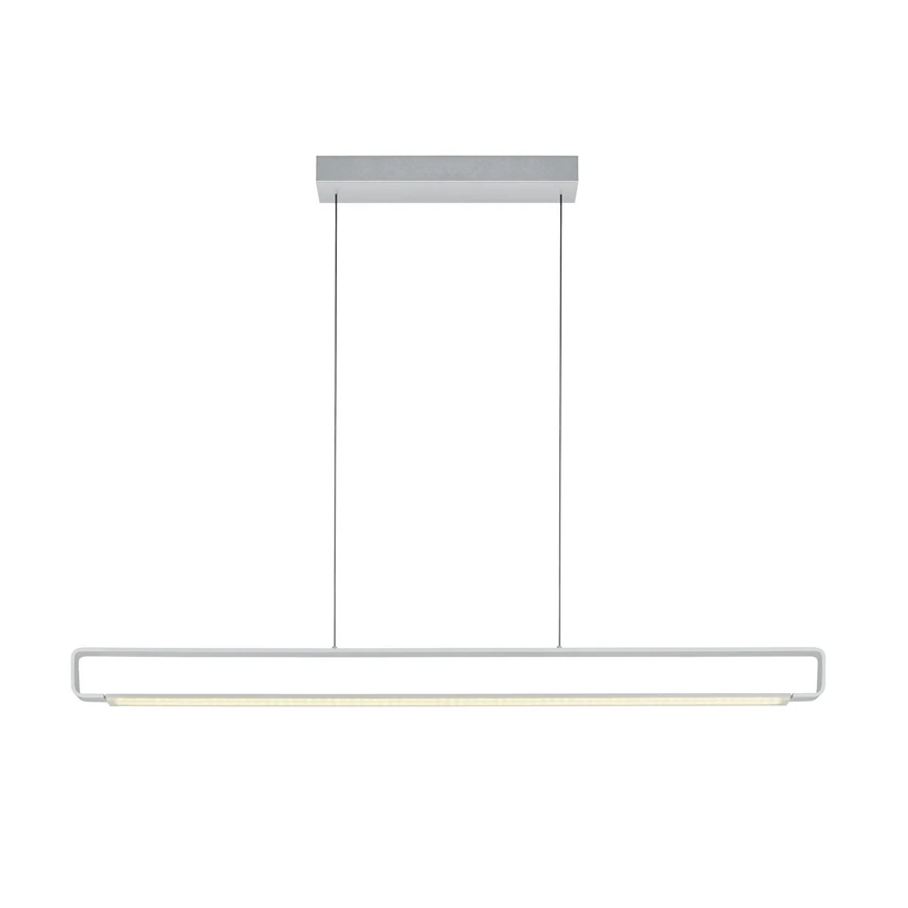 Apparecchio a sospensione LED Box con elemento luminoso ruotabile Il paralume dell'apparecchio a sospensione Box ha la forma di una cornice piatta e lunga. La sospensione dell'apparecchio in alluminio può essere variata fino a 150 cm ed è dotata di un lungo elemento luminoso nella parte inferiore della cornice. I LED bianchi caldi con una resa cromatica particolarmente buona (Ra90) sono installati dietro una copertura satinata. Una caratteristica particolare è che l'elemento luminoso può essere ruotato di 360°. In questo modo è possibile cambiare la direzione della luce a seconda delle esigenze e impostare sia l'illuminazione diretta che quella indiretta o la luce irradiata lateralmente. La luminosità della luce può essere regolata anche con un apposito dimmer (non incluso).