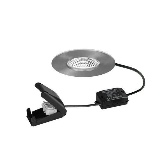BB20 Faretto da incasso a LED IP65 con driver LED commutabile e scatola di connessione I bagni, le aree benessere e molti altri ambienti umidi del settore privato o commerciale possono essere dotati del faretto a LED BB20, che è resistente alla polvere e protetto dai getti d'acqua con grado di protezione IP65. Si monta senza attrezzi con le molle di montaggio, può essere installato in soffitti di spessore fino a 1,7 cm e non è dimmerabile. Il faretto emette una luce bianca calda, che viene emessa con un angolo di 36° ed è distribuita in modo ottimale dal riflettore argentato con distribuzione della luce a fascio largo simmetrico a rotazione attraverso la copertura in plastica trasparente.