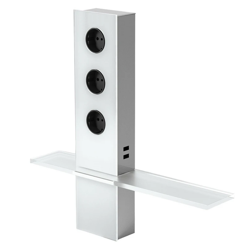 Oltre a tre prese, questa torre di presa ha due prese USB sul lato e un pratico ripiano in vetro da 8 mm di spessore sul quale è possibile posizionare comodamente il proprio smartphone per la ricarica. Anche questo ripiano aggiuntivo gioca un ruolo importante nel design, poiché il vetro trasparente in combinazione con il corpo in acciaio inossidabile spazzolato rende la torre di prese meravigliosamente elegante e decorativa. Per apparecchi fino a max. 3.500 W. 230 V / 16 A.