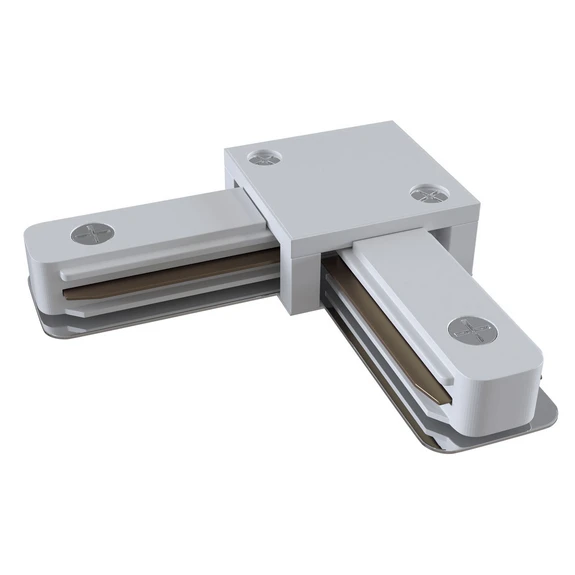 Connettore a L Binario per sistemi a circuito singolo in bianco Questo singolo elemento può essere utilizzato per collegare due binari tra loro con un angolo di 90°.
