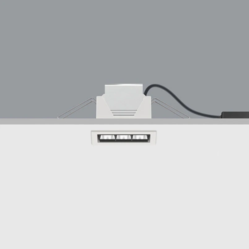 Apparecchio da incasso a soffitto Compar LED di ALS come wallwasher a lente, 6 W LED, per il controllo tramite App L'apparecchio da incasso a soffitto Compar con cornice piatta e rettangolare in alluminio fatto luce ai LED integrati ad alta potenza su un lato grazie alla speciale tecnologia della lente Softec; la luce viene schermata direttamente verso il basso con un angolo di 70°. Ciò rende Compar ideale per l'illuminazione indiretta sopra la parete, dove vengono presentati anche quadri, ecc. o per l'illuminazione ad ampio raggio di un'esposizione di merci a lato. Grazie alle molle di montaggio in dotazione e al collegamento a morsetti plug-in, il lavoro di installazione è minimo; il dispositivo di alimentazione viene posizionato separatamente dietro il soffitto. La configurazione e il funzionamento avvengono tramite l'App per Tablet/Smartphone.