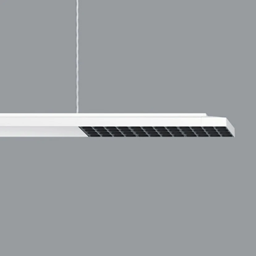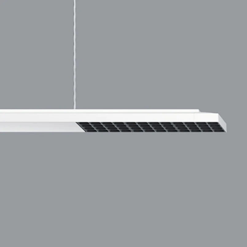 L'apparecchio a sospensione Jilly LED fornisce sia una luce indiretta attraverso il soffitto che un'illuminazione diretta. Tre fonti di luce sono integrate nel corpo piatto e rettangolare in alluminio e plastica. I LED che brillano verso l'alto sono coperti da un diffusore di plastica strutturato che diffonde la luce in modo particolarmente ampio, in modo che un'ampia sezione della stanza sia fornita di un'illuminazione di base con un solo apparecchio. I LED che irradiano verso il basso si trovano su entrambe le estremità longitudinali dell'apparecchio; i sistemi di lenti in polimero ottico e le lamelle antiabbaglianti assicurano una distribuzione ovale e ampia della luce con poco abbagliamento - ideale per esempio per le moderne postazioni di lavoro doppie. Con un controllo DALI esterno, l'uscita della luce può essere regolata (dimmerazione/commutazione solo per tutti e tre i punti luce insieme).