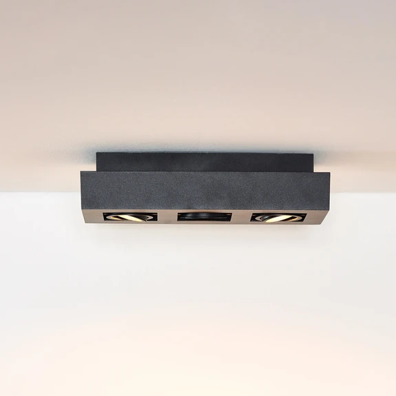 Il faretto da soffitto Xirax è dotato di tre spot da incasso, rotanti e orientabili, che possono essere regolati nel colore della luce fino a un bianco più caldo (da dimmer a caldo) quando sono dimmerati (dimmer esclusivo, possibile tramite dimmer a parete esterno).