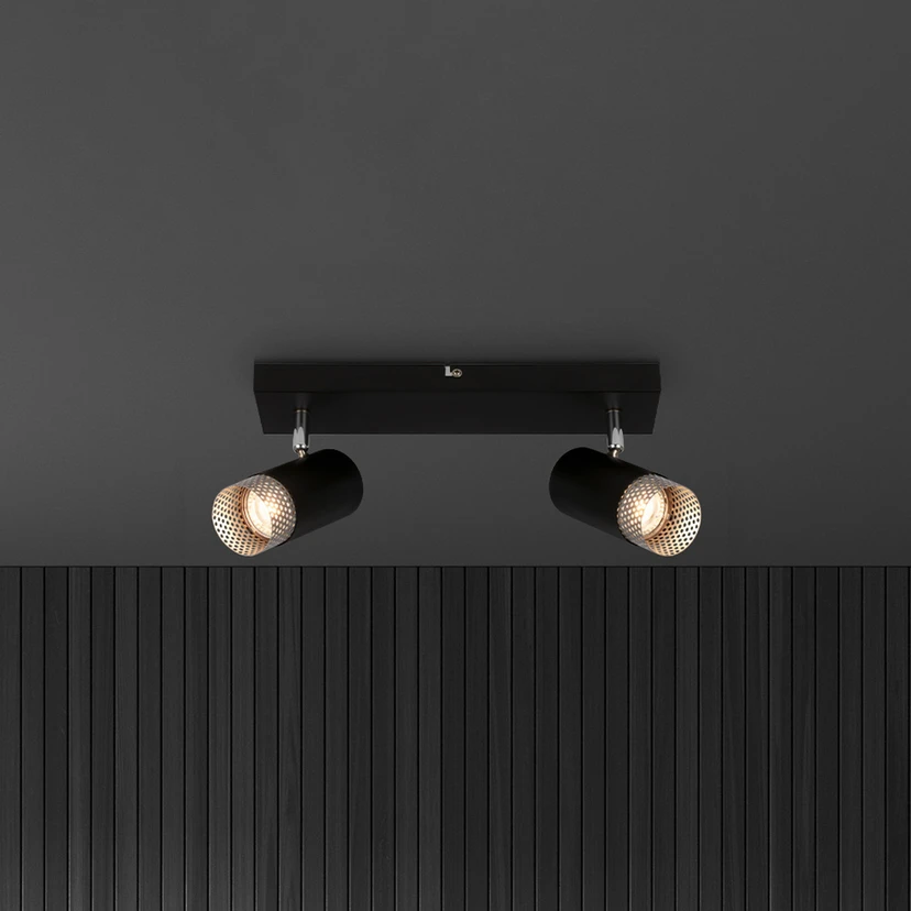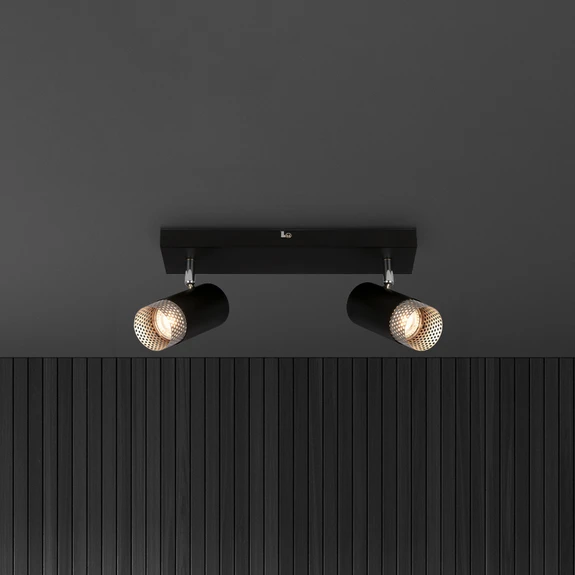 Faretto da soffitto Plek a due luci in metallo nero con attacchi in argento opacoIl faretto da soffitto Plek si presenta in modo assolutamente moderno con la combinazione di nero liscio, bracci corti in cromo e attacchi sulle uscite della luce in argento opaco, che non solo influenzano l'aspetto del faretto da soffitto, ma anche l'effetto luminoso con il loro schema di fori. Le due teste cilindriche possono anche essere ruotate e orientate, in modo da adattare perfettamente il faretto da superficie Plek alle rispettive condizioni.
