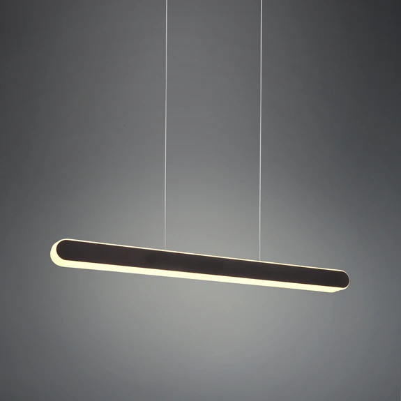 Apparecchio a sospensione Helios LED con fascio superiore e inferiore, lunghezza regolabile, con funzione dim e CCT L'apparecchio a sospensione Helios LED è una fonte di luce assolutamente moderna per soggiorni e salotti. Il corpo in metallo è composto da tre elementi che possono essere estesi in senso longitudinale per adattarsi alla lunghezza di un tavolo o di un bancone. I LED integrati sono collocati dietro coperture satinate che diffondono la luce verso l'alto e verso il basso. Sul corpo sono integrati dei pulsanti. Uno serve a commutare e controllare la luminosità in tre fasi; l'altro consente di regolare liberamente la temperatura di colore o di selezionarla in tre fasi (bianco caldo, bianco universale, luce diurna).