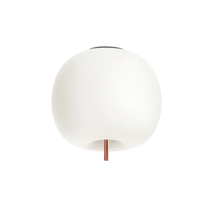 La plafoniera Kushi convince con le sue curve morbide e naturali, che nel loro aspetto complessivo richiamano la forma di una mela. Il paralume in vetro soffiato a bocca è opalino e a doppio strato. Al centro è attraversato da un delicato stelo metallico di colore contrastante, che sporge leggermente nella stanza. Kushi è un incontro di forme e colori diversi che interagiscono armoniosamente tra loro e diffondono una sensazione di leggerezza nell'ambiente. La luce diffusa che si irradia nella stanza illumina l'ambiente e rende Kushi un oggetto di illuminazione elegante e senza tempo per numerosi ambienti e stili abitativi.