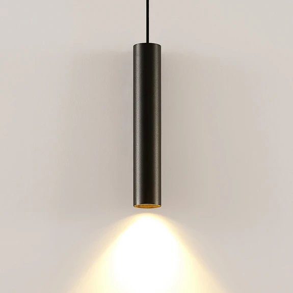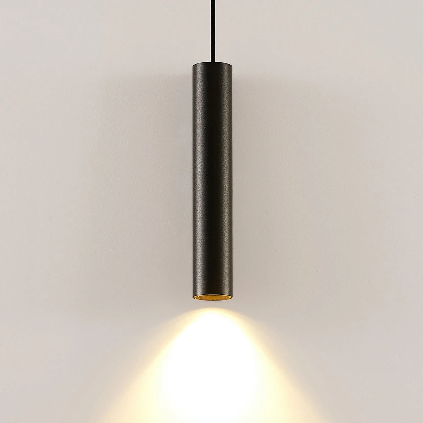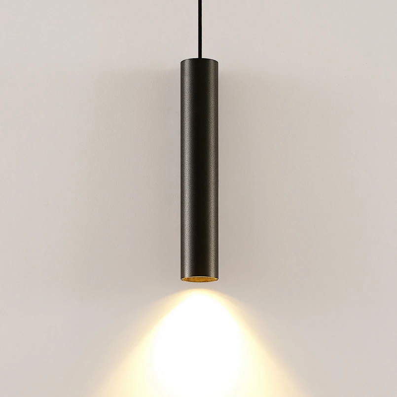 Lampada a sospensione Ejona, nera e stretta, con paralume in alluminio e riflettore intercambiabile Ejona è adatta a numerosi interni moderni e il suo utilizzo non è limitato agli ambienti privati; la lampada a sospensione può essere utilizzata anche in un ambiente commerciale. Ad esempio, le sale vendita delle boutique sono spazi adatti che possono essere perfettamente valorizzati da Ejona. Se necessario, il riflettore interno può essere cambiato, perché oltre all'inserto nero è incluso anche un anello in un'accattivante tonalità dorata, che non solo crea un efficace contrasto cromatico, ma ha anche un effetto caldo e piacevole sull'immagine della luce. La lampada giusta può essere selezionata individualmente, poiché oggi esistono numerose sorgenti luminose per il portalampada, soprattutto con tecnologia LED a risparmio energetico e a lunga durata. È inoltre possibile scegliere tra diverse angolazioni del fascio di luce, in modo che la luce si diffonda nell'ambiente come un faretto o con un fascio più ampio.