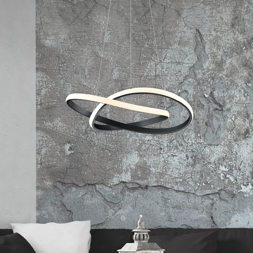 Lampada a sospensione Course LED dal design futuristico - dimmerabile tramite interruttore a parete Con il suo design costituito da un lungo profilo metallico curvo, la lampada a sospensione Course LED si armonizza perfettamente con gli interni moderni. I LED sono integrati lungo tutta la lunghezza del profilo e forniscono una luce ad alta efficienza energetica su tutti i lati. Grazie alla funzione dimmerabile, la luminosità può essere regolata al 100%, 50% o 25% premendo più volte l'interruttore a parete.