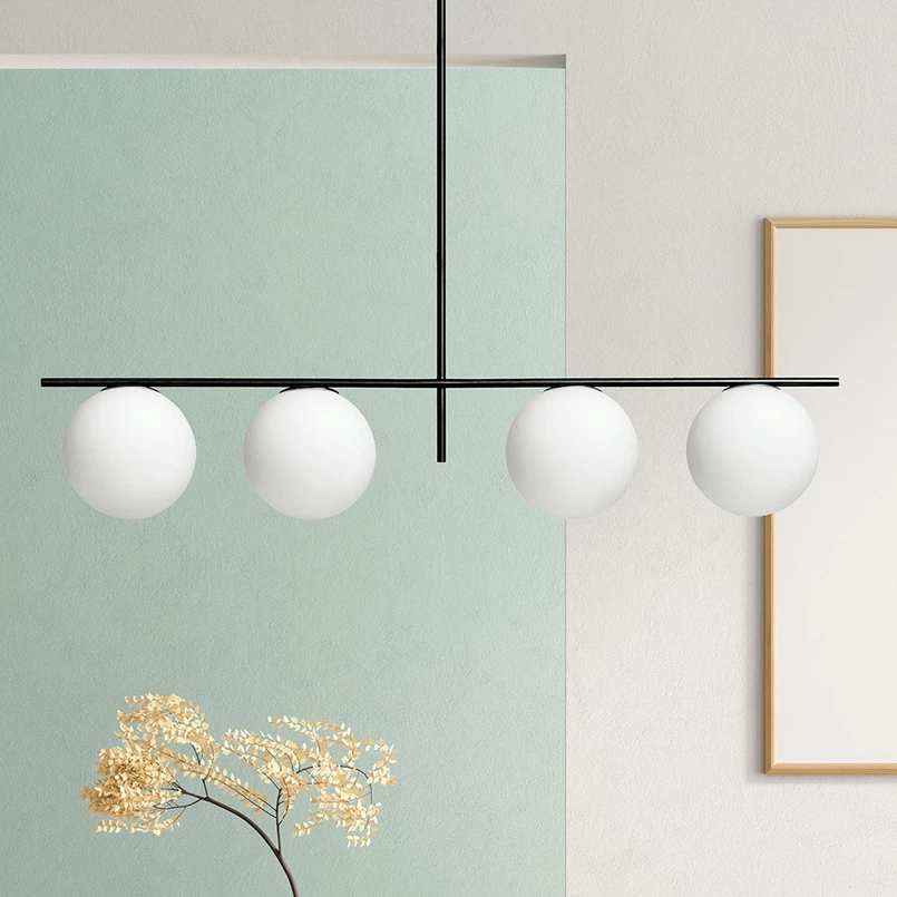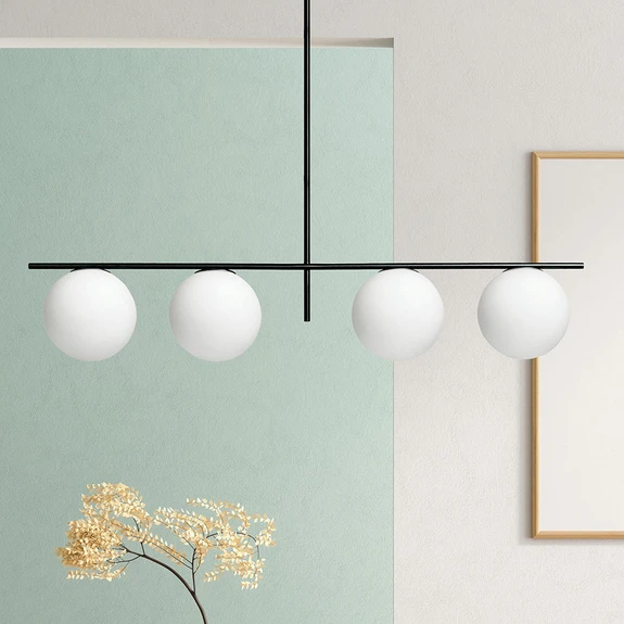Lampada a sospensione a quattro luci Jugen con sospensione regolabileLa forma della lampada a sospensione Jugen è adatta all'uso in una sala da pranzo sopra il tavolo. La sospensione della lampada può essere regolata in due misure durante il montaggio, in quanto la lampada ha due tubi di lunghezza diversa che possono essere facilmente accostati. La struttura è laccata nera, lavorata rigidamente e dotata di quattro paralumi sferici rivolti verso il basso. I paralumi sono in vetro bianco e contrastano con l'asta nera. Questa lampada appartiene alla linea di prodotti Miloox di Sforzin, caratterizzata da un design insolitamente fresco e dalla combinazione di materiali di tendenza.