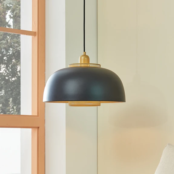 Elegante lampada a sospensione Miraca in nero e oro con emissione di luce calda - ideale per la sala da pranzo o il tavolo da caffè Questa elegante lampada a sospensione conferisce alla vostra casa quel qualcosa in più. La luce può essere dimmerata con un dimmer esterno per regolare la luminosità a proprio piacimento ed è disponibile nei colori nero e oro. L'apparecchio in ferro è adatto ad accogliere sorgenti luminose con portalampada E27. Con questa lampada potete contare sull'eccezionale qualità del marchio Lindby. La lampada a sospensione spicca per il suo design moderno, è ideale per qualsiasi zona pranzo o soggiorno e non solo offre un bellissimo gioco di luce, ma ha anche uno scopo decorativo.
