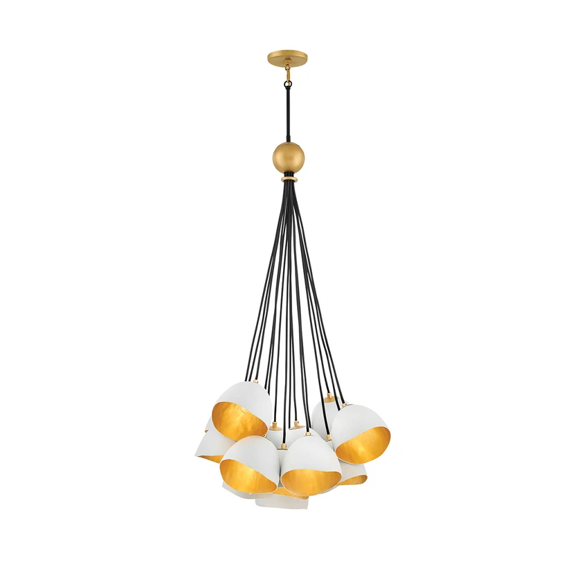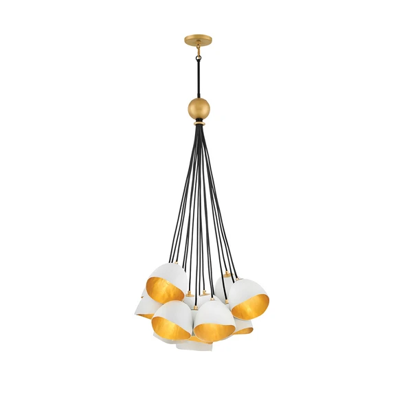 lampada a sospensione a 15 fiamme NulaI quindici paralumi a forma organica e semicircolare della lampada a sospensione Nula hanno un aspetto esterno bianco gesso. Ogni paralume è appeso a un cavo nero che si avvolge in una sfera dorata. Tra la calotta e questa sfera si possono inserire aste di diversa lunghezza, che consentono di modificare la sospensione. Inoltre, intorno ai cavi è incastonato un discreto anello di bloccaggio dorato, che può essere spostato verso l'alto e verso il basso e fa sì che i paralumi siano più distanti tra loro o più vicini. Nula offre quindi non solo un aspetto e un fissaggio flessibili, ma anche un concetto di illuminazione individuale che è sia decorativo che funzionale per i grandi spazi.
