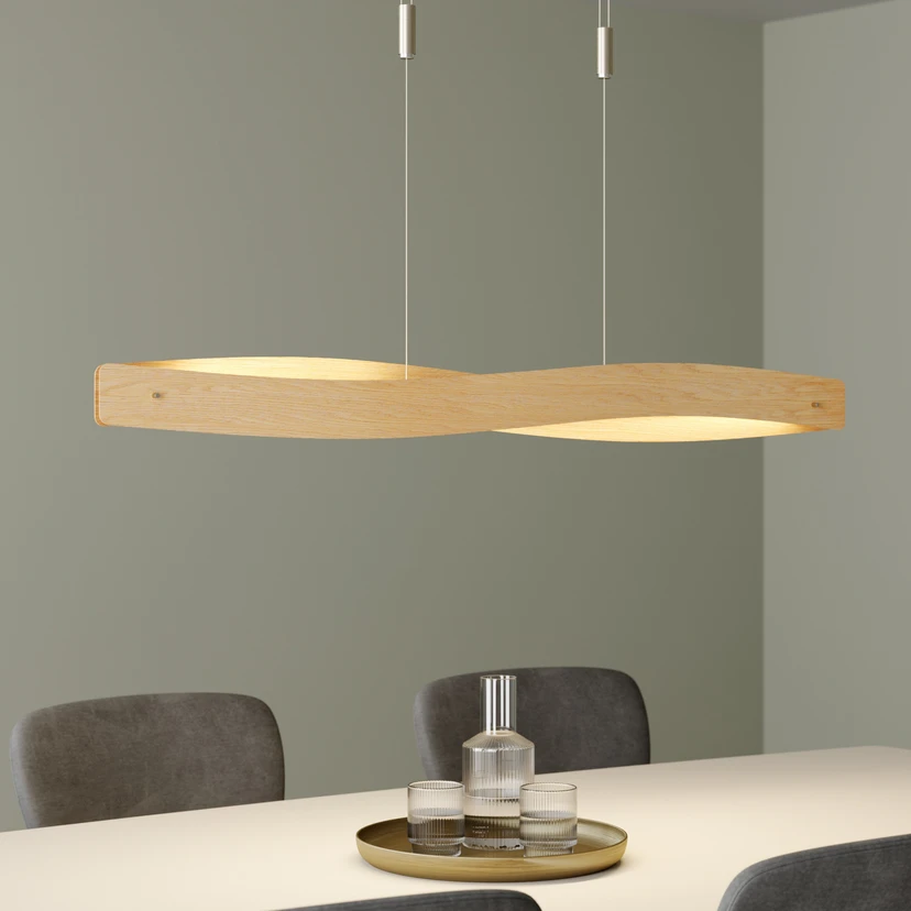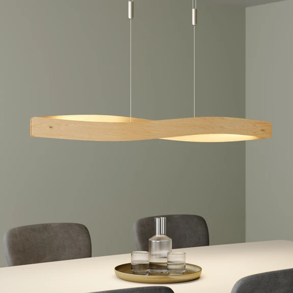 Lian - lampada a sospensione LED impiallacciata in rovere, dimmerabile Con la sua forma elegantemente curva, la lampada a sospensione LED Lian fa un figurone sopra qualsiasi tavolo da pranzo allungato. I due pannelli in legno curvato conferiscono all'apparecchio un aspetto giocoso senza perdere il suo tocco lineare. L'effetto luminoso della lampada a sospensione è particolarmente accattivante, in quanto Lian crea una luce verso l'alto e una verso il basso. In questo modo si ottiene un'illuminazione superficiale diretta verso il basso e allo stesso tempo una luce indiretta verso il soffitto, conferendo all'ambiente un efficace effetto di profondità. I due pannelli decorativi sono impiallacciati in vero legno di quercia, a vantaggio non solo della qualità dell'apparecchio, ma anche delle attuali tendenze di arredamento. Questa lampada a sospensione in legno si armonizza perfettamente con gli stili abitativi di ispirazione scandinava in cui dominano i colori e i materiali naturali. Lian è perfetta anche per chi apprezza la flessibilità della zona pranzo. Innanzitutto, l'altezza della lampada a sospensione può essere facilmente regolata. L'altezza può essere regolata grazie a un meccanismo saliscendi facile da azionare. A tal fine, è sufficiente premere con due dita i due cilindri fissati al centro della sospensione del cavo e spingere la luce verso l'alto o verso il basso. In questo modo, la sospensione dell'apparecchio può essere variata da 105 a 195 cm. D'altra parte, la luminosità di Lian può essere variata all'infinito. Basta un dimmer a taglio di fase discendente o anteriore, collegato esternamente all'apparecchio, e Lian può soddisfare un'ampia gamma di requisiti di luminosità nel soggiorno. Infine, l'apparecchio vanta un eccellente indice di resa cromatica (CRI > 90)! La lampada LED a sospensione Lian è un prodotto di qualità fabbricato in Germania!