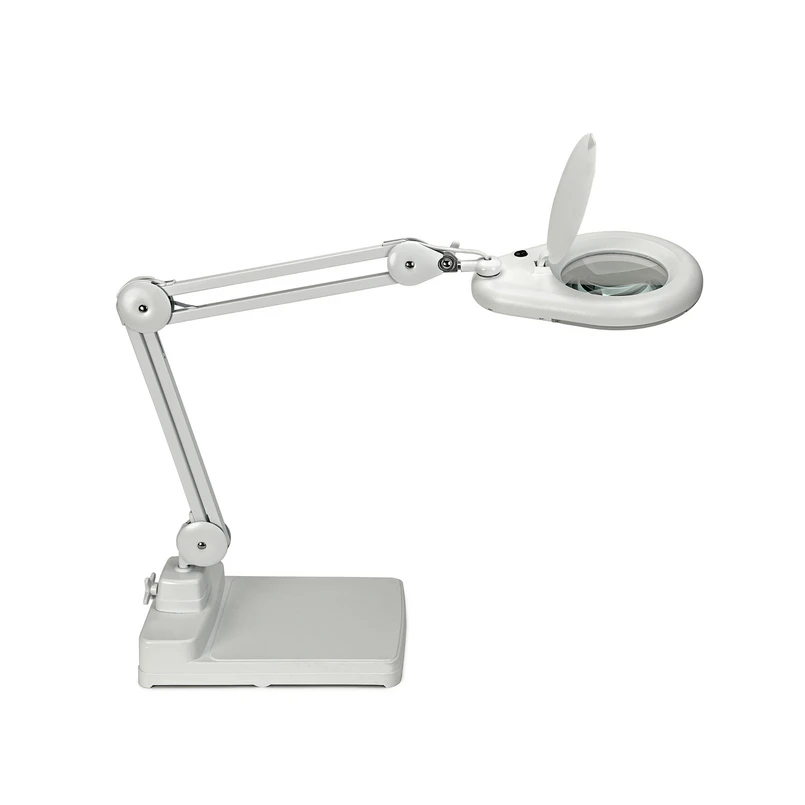MAULviso è una lampada con lente di ingrandimento stabile e solida, altamente regolabile, dotata di un robusto braccio metallico a parallelogramma e di una base stabile con snodo girevole. È ideale per lavori di precisione in laboratori, officine, studi medici o anche in ambito privato per lavori di meccanica di precisione. La lente in vetro vero da 3 diottrie integrata ingrandisce 1,75 volte, i 90 LED disposti nella testa dell'illuminante a forma di anello diffondono una luce di colore bianco freddo che illumina l'area di lavoro senza ombre.