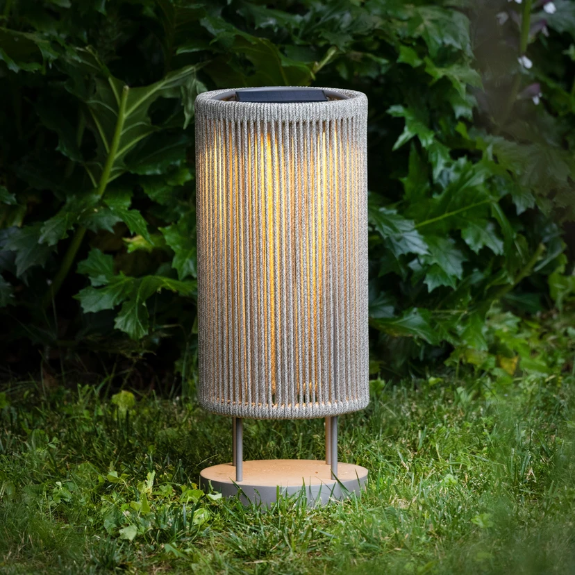 Elegante lampada da pavimento Rop&Strip LED dall'aspetto naturale con modulo solare La lampada da pavimento solare Rop&Strip LED ricorda una lanterna per il suo aspetto. Il suo aspetto naturale è enfatizzato dal colore e dal materiale. La corda intrecciata utilizzata in combinazione con l'alluminio robusto e i dettagli in teak ne fanno una fonte di luce accattivante per gli ambienti esterni. Grazie al moderno modulo solare, è possibile selezionare e impostare tre diverse modalità: - 1ª modalità: vengono monitorati i parametri di consumo energetico, riserva di energia e tempo di buio e la luminosità dei LED si basa su questi parametri per rimanere accesi per tutta la notte - 2ª modalità: viene attivato il sensore di movimento e si accende automaticamente al crepuscolo non appena rileva un movimento - 3ª modalità: la luce è accesa in modo permanente e può funzionare fino a 5 ore a piena carica. L'intensità luminosa può essere regolata individualmente, prolungando la durata della luce fino a 200 ore. Il sensore di movimento è spento - Raggio d'azione del sensore: 6 m, ambito di rilevamento: 120