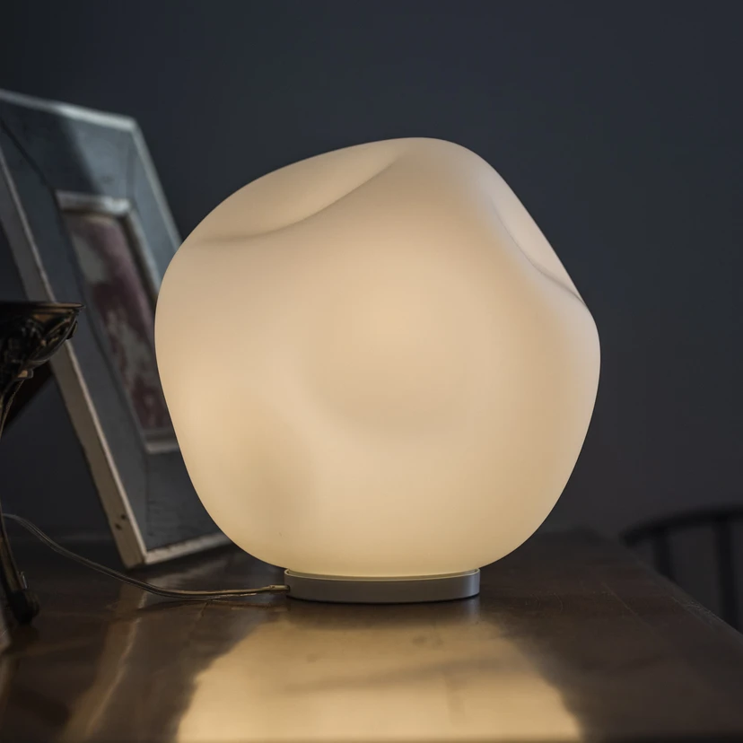 Lampada da tavolo di design Hoba in vetro soffiato a mano Hoba, che ricorda un meteorite, è una lampada da tavolo asimmetrica in vetro soffiato opaco che illumina l'ambiente con una luce calda e morbida. È realizzata con un processo produttivo a stampo aperto che permette di ottenere forme simili ma sempre diverse, uniche ma ripetibili.