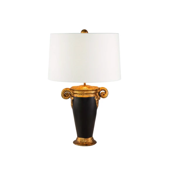 Lampada da tavolo Gallier con base dal design antico La base della lampada da tavolo Gallier ha la forma di una colonna antica in nero con decorazioni dorate. Il paralume in tessuto bianco di forma cilindrica, fissato all'asta sovrastante, crea un contrasto sorprendente. La luce si accende e si spegne tramite l'interruttore integrato nel cavo.