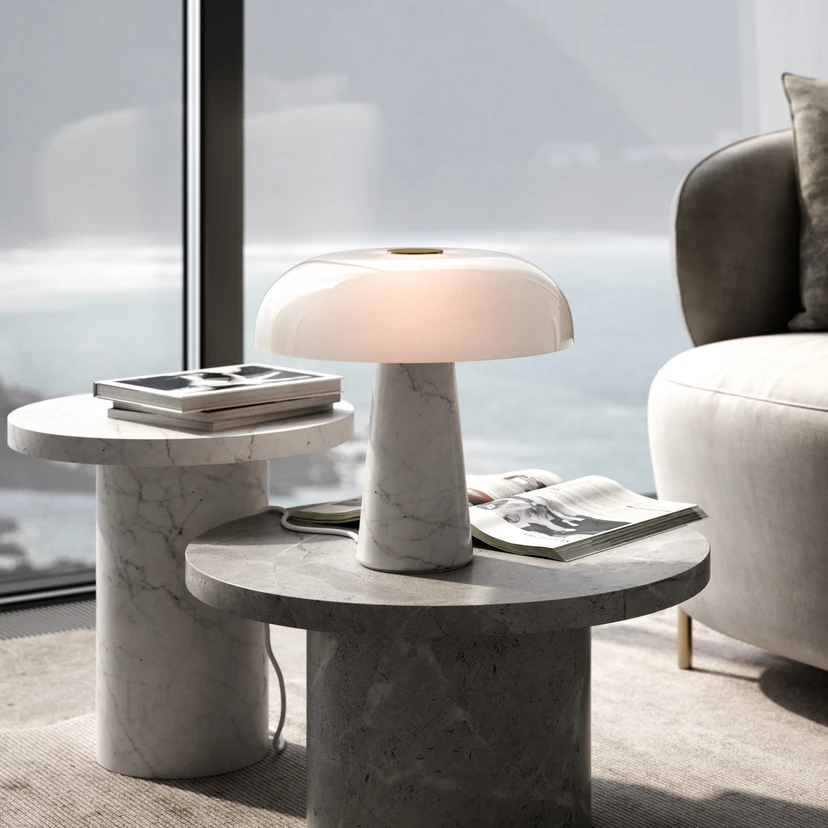 Elegante lampada da tavolo Glossy con base in marmoLa lampada da tavolo Glossy diventa un'attrazione in ogni ambiente grazie al suo design di alta qualità. In camera da letto, in corridoio o in soggiorno: la lampada da tavolo può essere collocata in modo flessibile e valorizza qualsiasi ambiente. La base è in marmo, mentre il paralume è in vetro bianco. Attraverso il paralume, la luce si diffonde principalmente verso il basso e solo in modo diffuso attraverso il vetro, creando un ambiente piacevole nel soggiorno. La lampada si aziona tramite l'interruttore integrato nel cavo. Poiché il marmo è un materiale naturale, i colori e i motivi possono variare - Design: Maria Berntsen