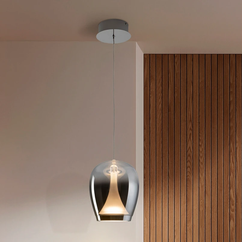 Lampada LED a sospensione Suspiro nei colori cromo e grigio fumo