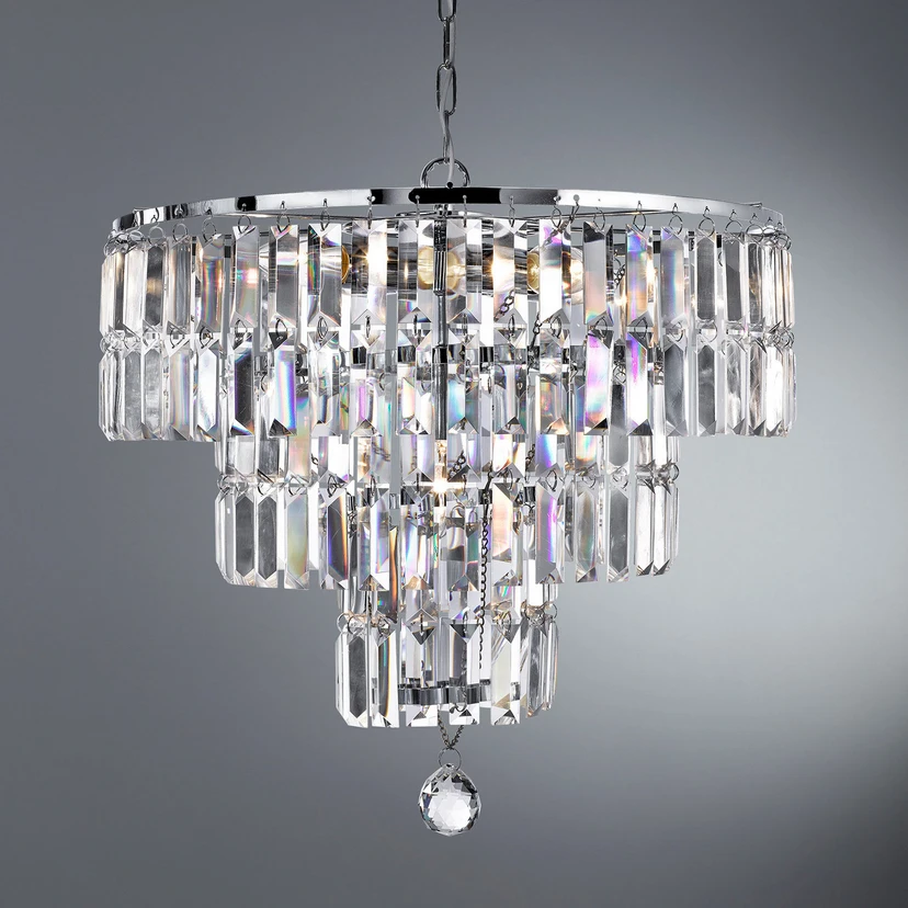 L'interpretazione moderna di un lampadario classico: Empire è costruito con luccicanti prismi di cristallo appesi a tre livelli. Il paralume è formato da tre anelli, ognuno con prismi di cristallo disposti a coppie, che compongono la struttura terrazzata di questo scintillante lampadario. L'anello più piccolo in basso si chiude con una goccia di vetro molato. I riflessi generati dai prismi creano un effetto luccicante mozzafiato.