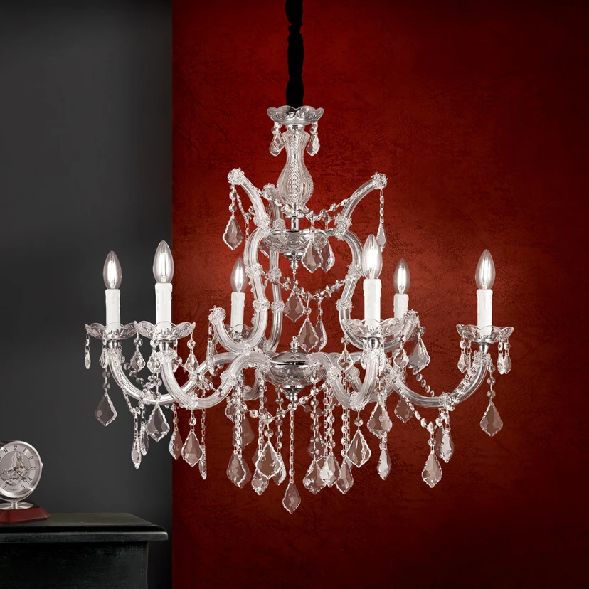 Lampadario particolare LILIANA in stile Maria Theresia con cascata di cristalli semi-molati. Con questo lampadario si arreda splendidamente qualsiasi ambiente e si aggiunge un tocco di classe. Le lampadine a forma di candela conferiscono un carattere romantico e i meravigliosi cristalli creano straordinari effetti luminosi grazie alla riflessione della luce. Immergetevi quindi nel mondo del barocco e godetevi momenti di relax alla luce di questa brillante lampada.