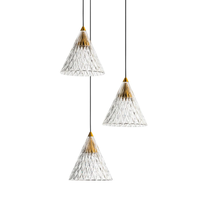 L'apparecchio a sospensione Veneto combina un design elegante con un'efficiente tecnologia LED. I paralumi sono a forma di cono e dotati di LED bianchi caldi che forniscono una luce piacevole e accogliente. Le tonalità trasparenti sono fatte di acrilico chiaro. Con la loro struttura, ricordano il vetro di cristallo e forniscono riflessi accattivanti. I piccoli alloggiamenti che ospitano i LED sono fatti di metallo con una finitura in ottone nobile. Grazie ai punti di fissaggio decentrati, la posizione e l'altezza di sospensione di ogni paralume possono essere impostate a piacere - perfetto per l'illuminazione di tavoli e aree a seconda delle esigenze.