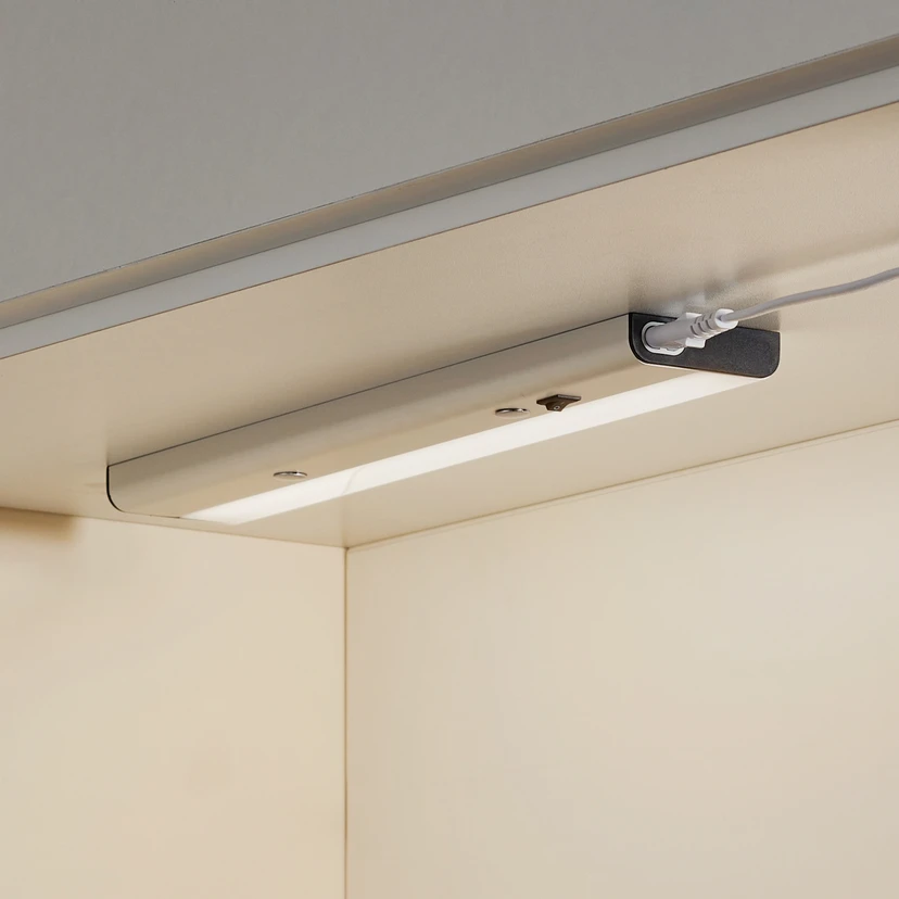 La lampada per mobili Linear Flat, lunga 37 cm e dal design ultrasottile, è facile da montare sotto un pensile oppure una mensola di scaffale in cucina oppure in officina. Qui posizionata, garantisce un’illuminazione ottimale del piano sottostante: infatti nel robusto alloggiamento in alluminio sono integrati LED di potenza ad alta efficienza energetica che forniscono una luce bianca di tonalità calda sufficientemente intensa. Grazie al vetro diffusore satinato, la luce viene inoltre diffusa e irradiata in modo uniforme. L'angolo di emissione è pari a 100°. È possibile anche un concatenamento con altre lampade delle serie, per un massimo di 43 pezzi. Con interruttore ON/OFF nell’alloggiamento. Incluso cavo di raccordo da 1,8 m con spina UE, un giunto e il materiale di montaggio.