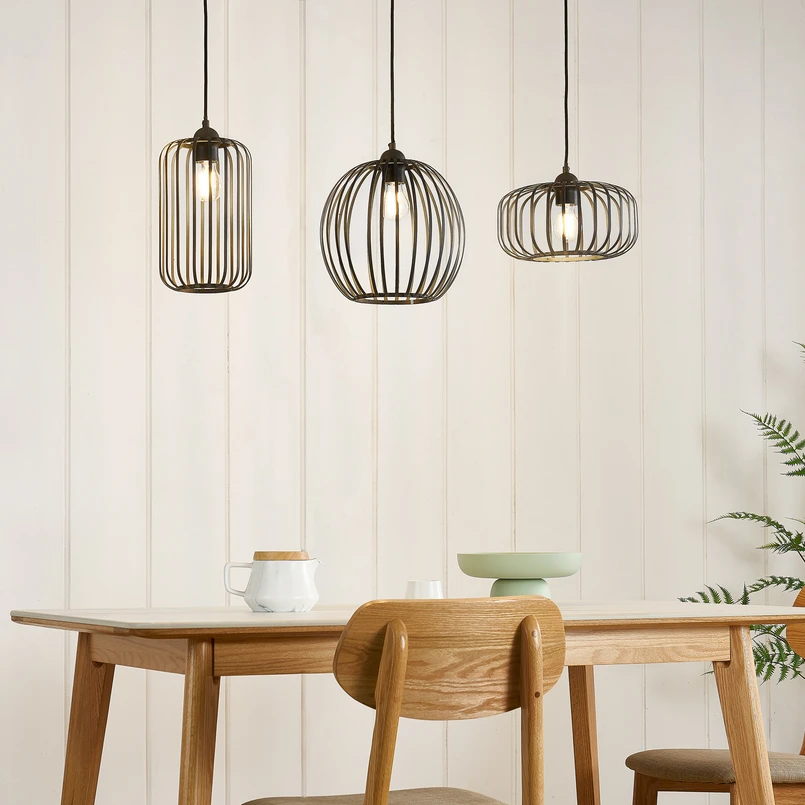Lampada a sospensione Krish a tre luci con paralumi a gabbia di forma diversa in neroLa lampada a sospensione Krish è un bellissimo oggetto di illuminazione per il tavolo da pranzo, dotato di paralumi a gabbia costituiti da montanti in ferro nero. Poiché la luce non può uscire in tutti i punti, si crea un bellissimo gioco di luci che integra luci e ombre e le riproduce sulle pareti e nella stanza. Ognuna delle tre tonalità ha una forma diversa, a volte stretta e alta, a volte sferica e infine larga e di altezza inferiore. Ciò che accomuna tutte le tonalità, tuttavia, è la loro forma rotonda. All'interno è presente una sorgente luminosa E27 che può essere dotata di lampade a scelta. Per aggiungere un tocco di stile all'insieme, consigliamo le lampade a filamento LED, che consumano pochissima elettricità ma sono state modellate sulle classiche lampade a incandescenza e quindi non mancano del loro fascino. Posizionato sopra il tavolo da pranzo, l'apparecchio a sospensione illumina in modo bello e accattivante, completando lo stile vintage.