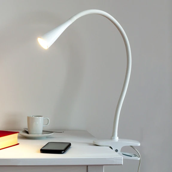 Lampada LED a morsetto Baris a risparmio energetico in forma sottile Le lampade da tavolo e le lampade da scrivania sono pratiche, ma a volte lo spazio non è sufficiente per un piede convenzionale. In questo caso si consigliano lampade con morsetto, che possono essere fissate rapidamente e facilmente al bordo di un tavolo, a uno scaffale o simili, dove rimangono saldamente fissate e non cadono facilmente. Questo esemplare con modulo LED integrato è caratterizzato da un telaio sottile e da una testa della lampada altrettanto discreta e di diametro ridotto. Per un orientamento ottimale della luce, l'asta è regolabile in modo flessibile in tutte le direzioni, ma il design consente anche di creare forme di luce indiretta quando la testa della lampada è rivolta verso il soffitto.