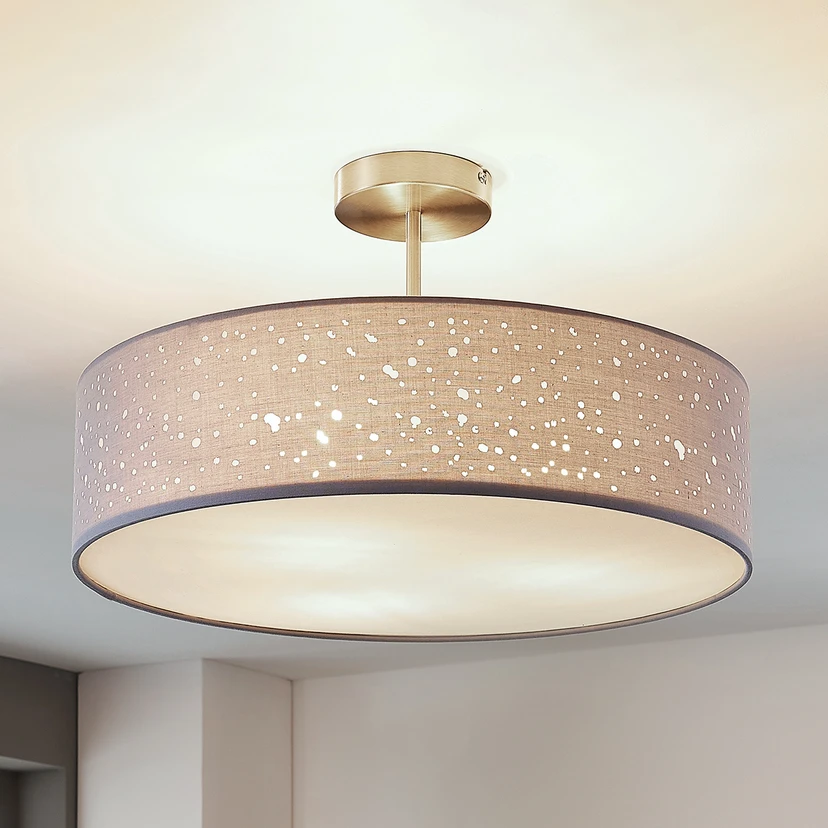 Plafoniera Umma montata a distanza dal soffitto con paralume rotondo in tessuto e un interessante motivo tagliato al laser