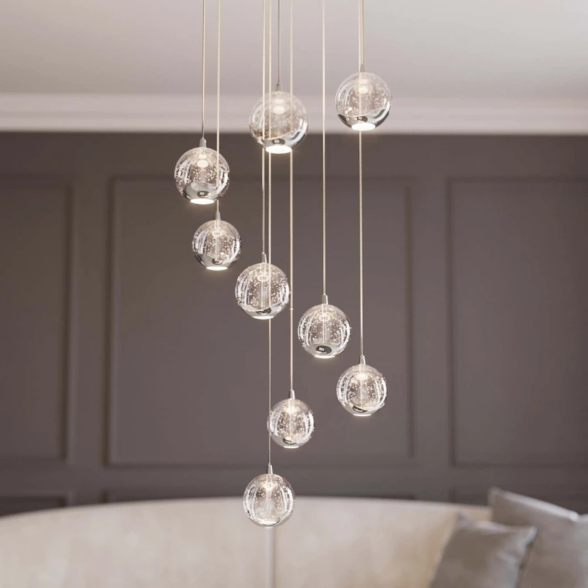 Lampada LED a sospensione a 9 luci Hayley con stravaganti globi di vetro in un moderno look cromato La bellissima lampada LED a sospensione Hayley fatto di lusso ed eleganza. Con le sue nove sorgenti luminose, è in grado di illuminare bene anche ambienti più ampi e lascia un'impressione unica nell'osservatore. Le nove sfere di vetro sono dotate di bolle d'aria decorative all'interno e un elemento metallico avvolge la parte inferiore di ciascuna di esse. Il moderno look cromato, in cui è stato rifinito anche il rosone dell'apparecchio, ne sottolinea il carattere sofisticato e lo rende una fonte di luce inconfondibile. Questo design ingegnoso rende la lampada uno stravagante accessorio per la casa anche quando è spenta.