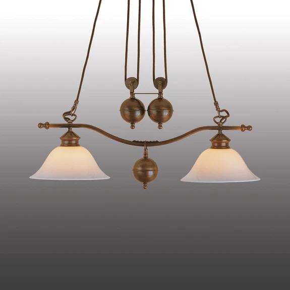 L'apparecchio a sospensione ANNO 1900 fornisce luce atmosferica, ad esempio per illuminare una tavola festosa. Questa bellissima sorgente di luce è realizzata in ottone brunito, le due tonalità sono realizzate in vetro curvato e multistrato Triplex Opal, che dà l'impressione di un morbido gradiente di luce. L'altezza può essere variata con una doppia trazione.