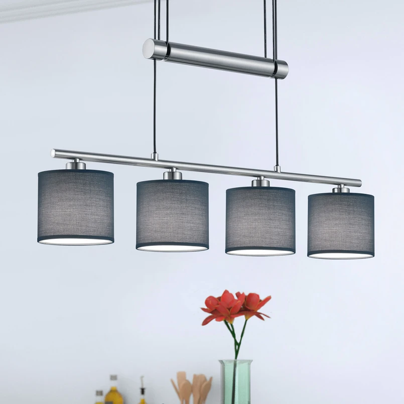 Lampada a sospensione a 4 luci Garda - regolabile in altezza fino a 150 cm La lampada a sospensione a 4 luci Garda è ideale per l'illuminazione del tavolo in una sala da pranzo o in un soggiorno moderno: Quattro paralumi in tessuto grigio sono distribuiti su una lunghezza di 77 cm e forniscono una luce diretta verso il basso per una distribuzione omogenea della luce. Inoltre, la luce penetra delicatamente attraverso il tessuto, creando un'atmosfera molto accogliente. L'altezza della lampada a sospensione Garda può essere regolata all'altezza desiderata tra 90 cm e 150 cm tramite una maniglia.