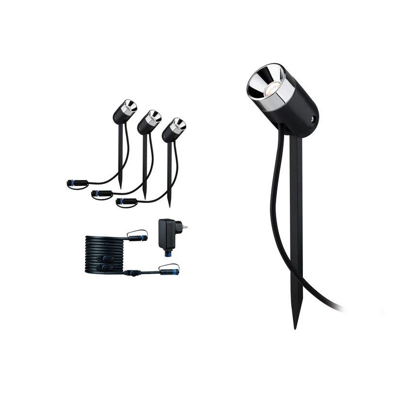 Faretto LED con picchetto Plug & Shine Pike con dettagli cromati in un set base di 3 Letti, alberi, facciate e sculture sono messi in risalto in modo specifico dalla luce regolabile della lampada con picchetto Pike. Ma il faretto colpisce per la sua eleganza anche di giorno, grazie alla sua finitura cromata lucida. Tutti i componenti necessari per il funzionamento sono inclusi. La spina del trasformatore serve per il collegamento a 230 V, mentre grazie al cavo di collegamento con uscite a 150 cm, 300 cm, 500 cm e 515 cm, le luci possono essere posizionate in modo variabile - Con una tensione di esercizio di 24 V e cavi, collegamenti e luci protetti dall'acqua, Plug & Shine di Paulmann è una soluzione di illuminazione versatile e sicura per le aree esterne.