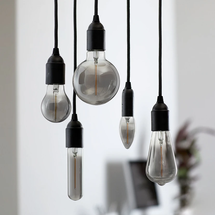 Lampada LED in vetro E27 2,3W colorata in grigio fumo Questa lampada LED in vetro colorato grigio fumo con base E27 è molto decorativa, non solo visivamente ma anche in termini di effetto luminoso. È adatta a tutte le luci di tendenza senza paralume, sia da tavolo che da terra o a sospensione, e fornisce una calda illuminazione decorativa. La sorgente luminosa non è adatta all'illuminazione generale degli ambienti.