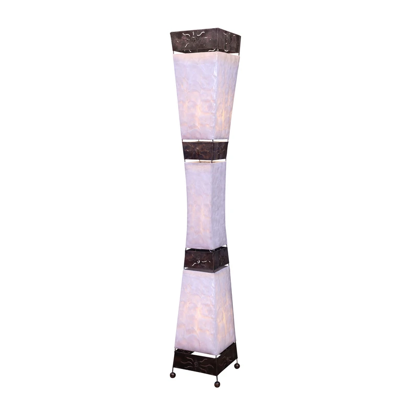 Lampada da terra Adrian con conchiglie di capiz bianche e quattro sezioni in metallo scuro La lampada da terra Adrian, realizzata a mano in Indonesia, è caratterizzata da un design unico e da una luce morbidamente scintillante. Il suo corpo è suddiviso in tre sezioni realizzate con conchiglie di capiz bianche e quattro elementi in metallo nero-marrone, ciascuno con un motivo solare. All'interno sono presenti due portalampada E14, quattro piedini e un cavo con interruttore.