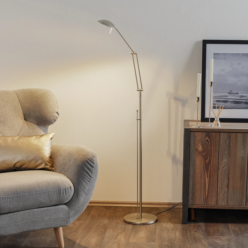 Piantana LED Carl, color nichelo, regolabile, dimmerabile