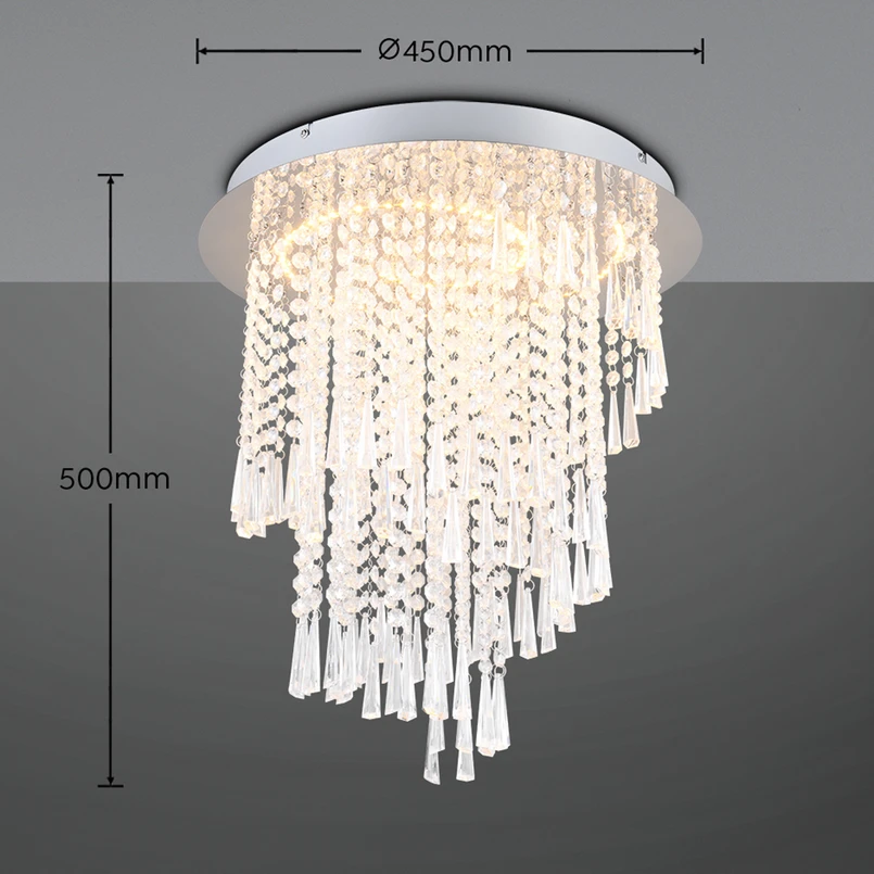 Lampada da soffitto Pomp LED: l'eleganza incontra la funzionalità CCT Sperimentate il potere trasformativo dell'illuminazione con la lampada da soffitto Pomp LED, una combinazione di acrilico trasparente e metallo cromato che aggiunge un tocco elegante a qualsiasi ambiente. La funzione CCT consente di regolare il colore della luce a seconda delle esigenze, dai toni caldi per un'atmosfera accogliente alle tonalità più fredde che favoriscono la concentrazione e la produttività. La plafoniera LED integrata di Pomp non è solo efficiente dal punto di vista energetico, ma anche durevole, in modo da poter godere di un'illuminazione affidabile e a bassa manutenzione per gli anni a venire. Il dimmer in dotazione consente di regolare la luminosità a proprio piacimento utilizzando il telecomando in dotazione o l'interruttore a parete esistente su tre livelli per creare l'atmosfera perfetta per il soggiorno, la sala da pranzo o il corridoio. Sia per le serate rilassanti che come fonte di luce ispiratrice, la plafoniera Pomp LED è un investimento che convince sia in termini di design che di funzionalità. Incluse 2 batterie AAA per il telecomando - Funzione di memoria inclusa - Funzione di luce notturna inclusa