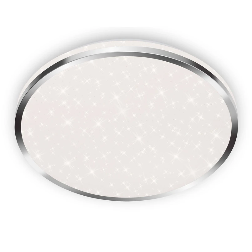 Questa plafoniera a LED rotonda con motivo a stella scintillante sul coperchio di plastica incorniciato da un bordo metallico è adatta anche per l'uso in bagno o in altre aree in cui possono verificarsi umidità e spruzzi d'acqua a causa del suo grado di protezione IP44. Quando l'illuminazione è accesa, l'arredamento brilla come un cielo pieno di stelle e l'apparecchio illumina contemporaneamente la stanza con luce bianca universale.