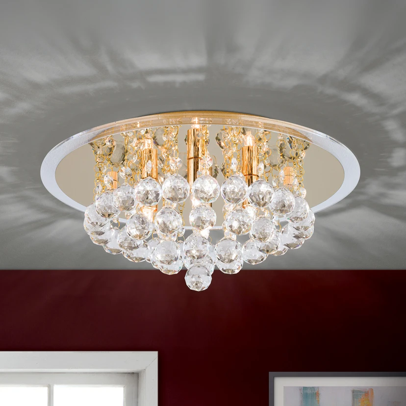 Questa lampada non deve necessariamente essere accesa per apparire, perché con la sua imponente presenza con cascata di cristalli al piombo garantisce momenti scintillanti. Quando i cristalli a forma sferica spezzano la luce emanata dai tubicini alogeni si creano meravigliosi riflessi di luce che vengono ulteriormente impreziositi dallo sfondo dorato.