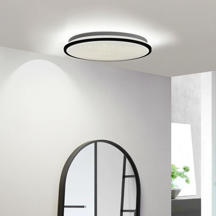 Plafoniera LED rotonda Glane con effetto stella, IP44 Il paralume della plafoniera LED Glane è inserito in uno stretto anello nero ed è rifinito con un effetto stella che fa scintillare la luce quando viene accesa, permettendo allo stesso tempo alla luce di faretto LED in modo uniforme nell'ambiente. La plafoniera piatta e piuttosto grande ha un grado di protezione IP44 ed è quindi adatta per l'uso in bagni e altre aree umide, oltre che in molti altri ambienti. Fornisce un'illuminazione di colore bianco caldo.