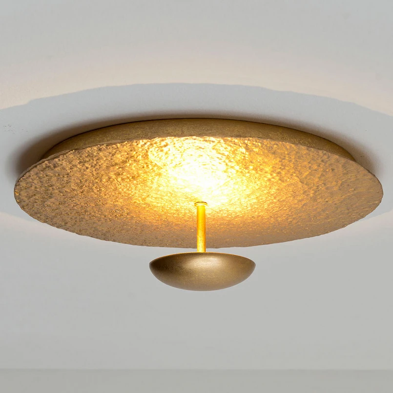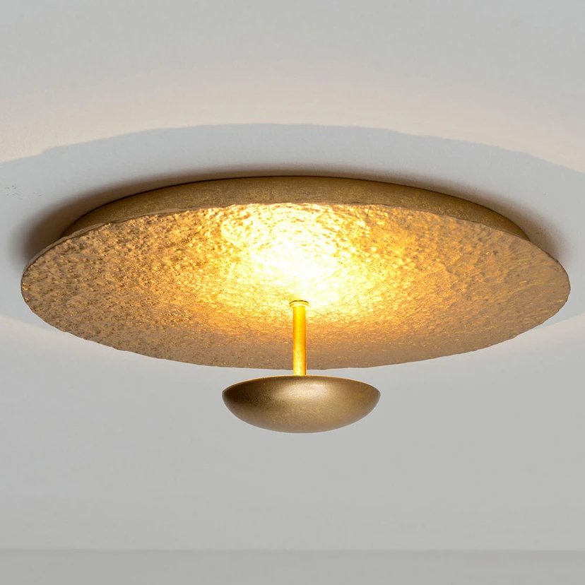 La plafoniera a LED Polpetta diffonde un'atmosfera di luce brillante. Sulla piastra di base rotonda in ferro laccato color oro con struttura martellata, due lampadine a LED sono installate dietro un piccolo disco di ferro frontale in oro, che irradiano la loro luce bianca calda in modo indiretto e quindi sia impostare la scena per la piastra di base e gettare un'ombra intorno alla piastra sul soffitto.