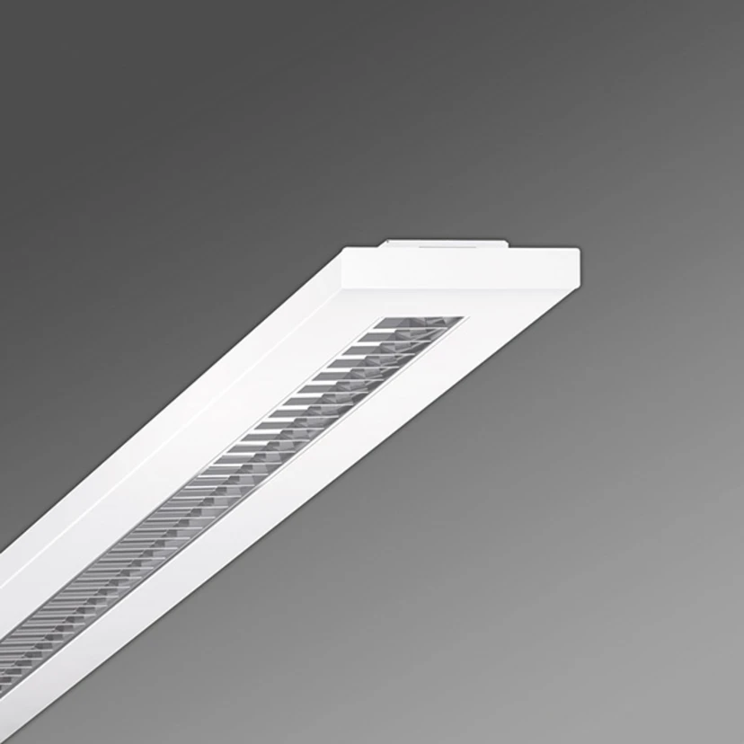 Questo sottile apparecchio LED a lamelle affascina per il suo aspetto minimalista, definito da un'altezza minima visibile di 2,6 cm. Nell'alloggiamento in lamiera d'acciaio è stata integrata una doppia ottica parabolica satinata con lamelle a basso profilo. L'alloggiamento incassato e sporgente verso l'alto crea una distanza dal soffitto, mentre le aperture per l'emissione della luce nella cornice creano un'aura di luce estetica che fa apparire l'apparecchio senza peso.