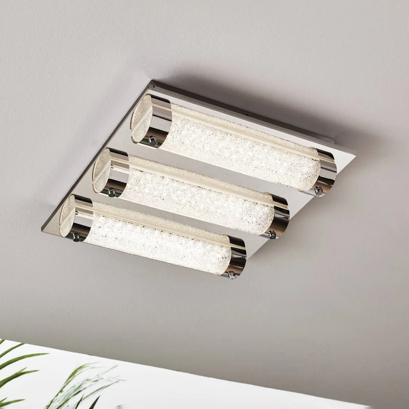 Tre tubi semicircolari in vetro trasparente, progettati con un aspetto di cristallo scintillante all'interno, si trovano in due supporti cromati ciascuno sulla piastra quadrata del soffitto in acciaio inossidabile. La piastra cromata riflette i tubi semicircolari, dotati al loro interno di LED bianchi universali. La luce brilla nella stanza e fa scintillare l'ottica di cristallo degli occhiali. Con l'apparecchio a soffitto Tolorico LED è possibile portare un'illuminazione di base luminosa in molti ambienti. Poiché è protetto dagli spruzzi d'acqua con classe di protezione IP44, può essere installato anche in bagno.