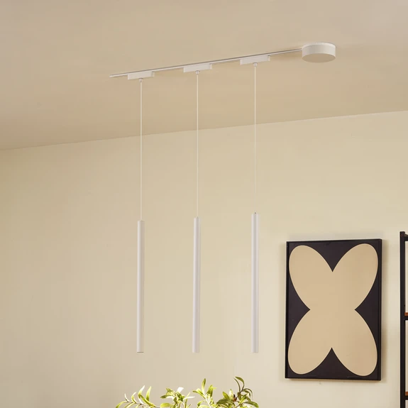 Sistema binario monofase Lumaro bianco con tre lampade LED a sospensione Il sistema binario Lumaro colpisce per il suo design semplice e moderno in una combinazione di colori bianchi. Viene fornito con tre lampade LED a sospensione dimmerabili e con colore di luce controllabile (CCT). In questo modo è possibile regolare la luminosità a seconda delle esigenze e impostare il colore della luce tra bianco caldo (2.700 K) e luce diurna (6.000 K). Componenti inclusi: - 1 x driver LED - 1 x telecomando (batterie escluse) - 1 x binario - 3 x lampade LED a sospensione